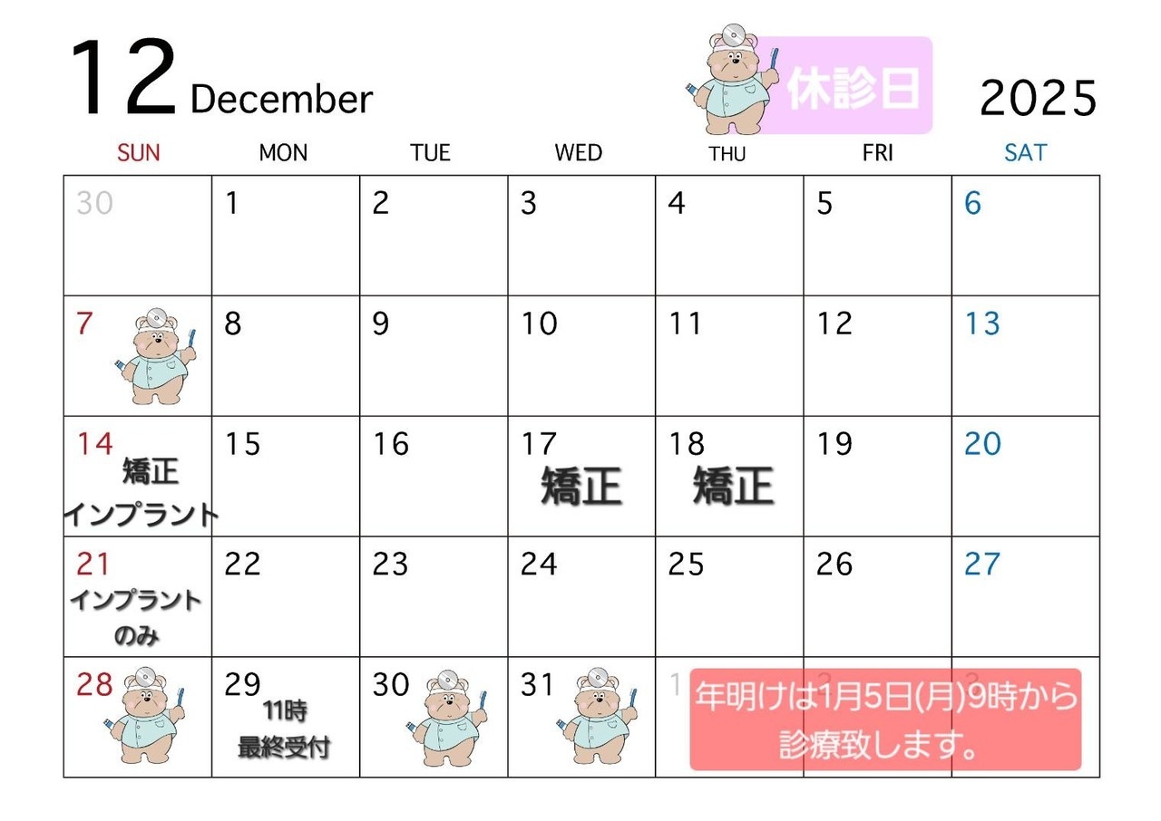 矯正は第1木曜日・第3水曜日の午後と第2・4日曜日に診療(月4回)。