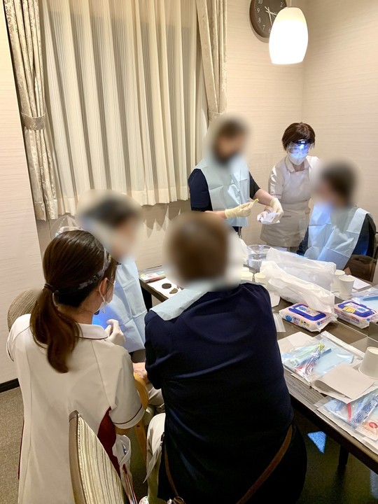 相互で実際に口腔内に触れていただき、スポンジブラシや口腔ウェッティ,保湿剤の使い方を説明させていただきました。