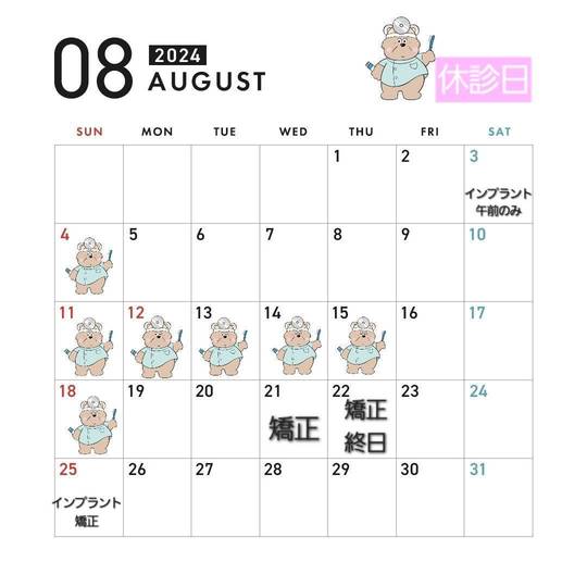 インプラント:8月3日(日)・25日(日)※3日のインプラント治療は午前のみ対応
