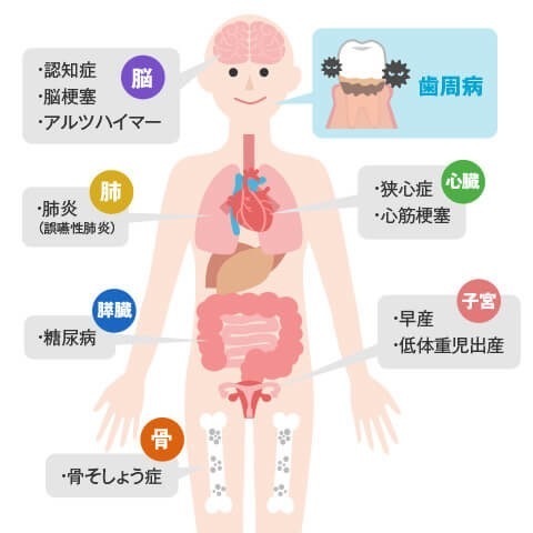 ちょっと怖いお話ですが、認知症の方の脳や低体重児出産をした方の羊水から、歯周病原因菌が検出されたという研究結果があります。