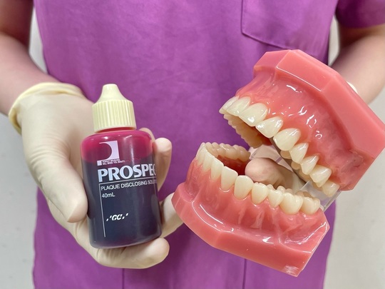 メインテナンスの際に当院では、歯に付着したプラーク(歯垢)などの汚れを赤く染める「染め出し」を行う場合がございます。この染め出しの目的は、患者さまへ「この部分が磨けていない」と指摘し、あら探しをするためでは決してありません。「本当は磨いていないのでは?」と疑っているわけでも、もちろんありません。患者さまへ、磨きにくい部分をお知らせする意図で行っています。